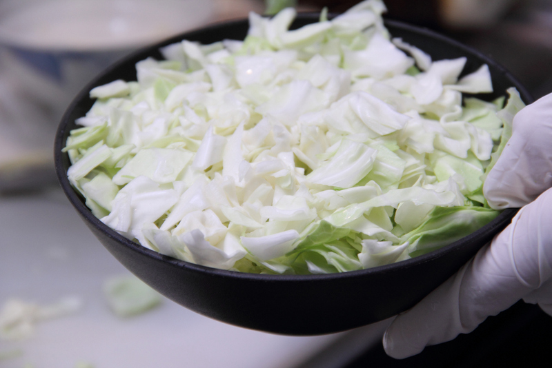 - Misture o repolho e o benishoga à massa e quando ele estiver envolvido pela massa, adicione o ovo sem misturar demais