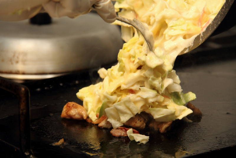 - Esquente a chapa e despeje um fio de óleo de gergelim. Frite o bacon e, em seguida o frango. Tempere o frango com shoyu e espalhe para colocar a massa por cima.