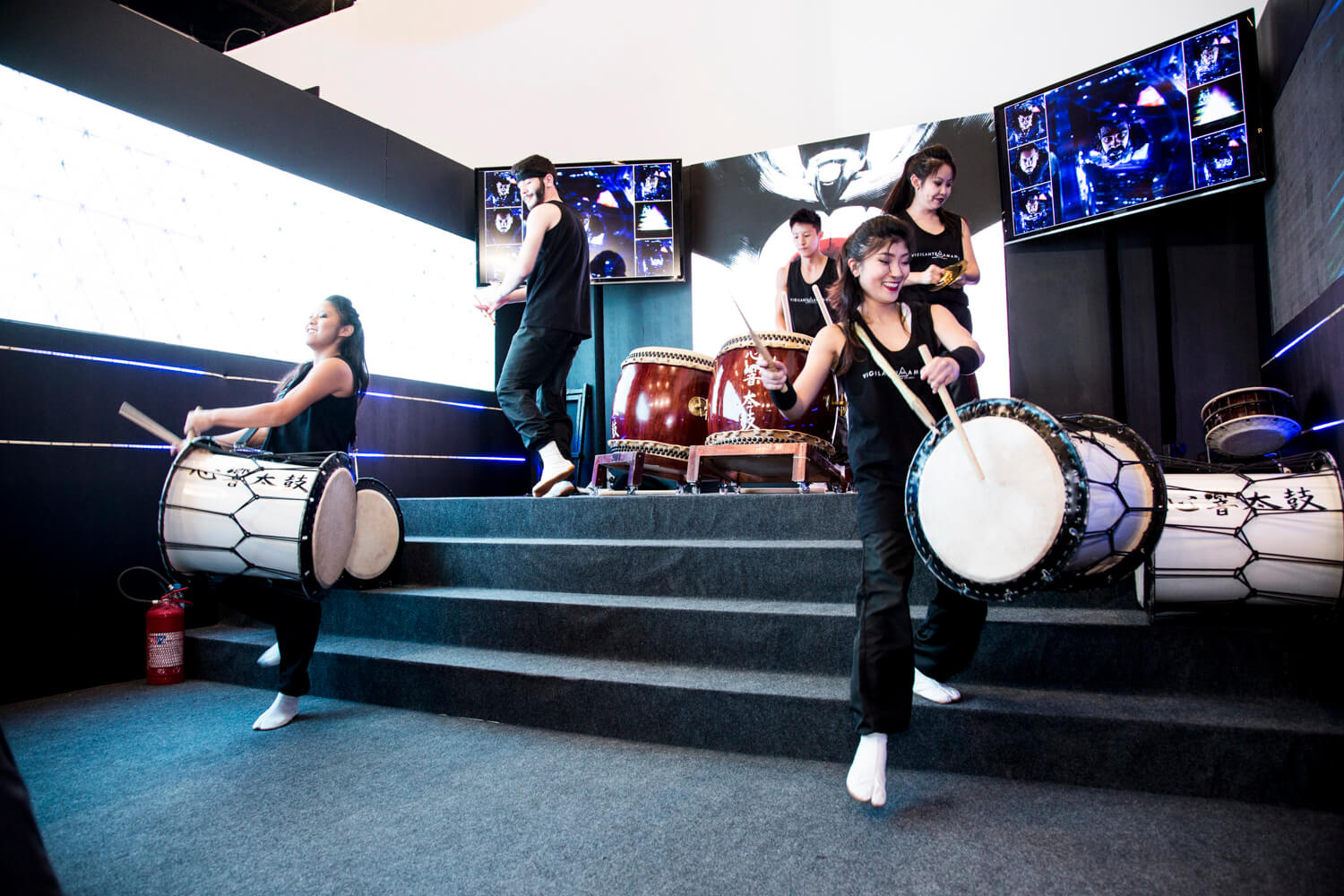 Apresentação do grupo de taiko Shinkyo Daiko no estande da Paramount
