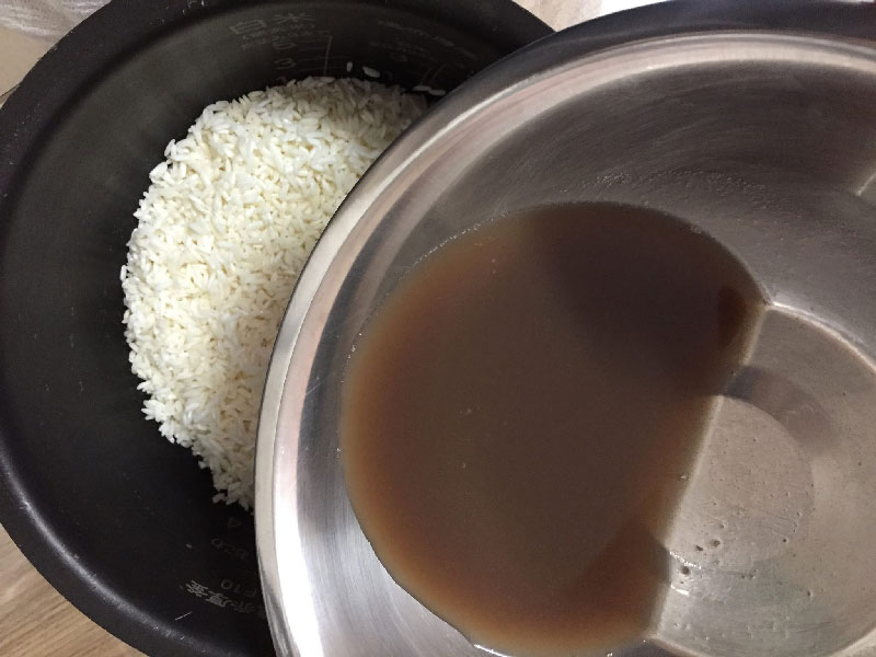 - Coloque o arroz, a água reservada da cocção do azuki (620 mL), o sal e o sake. Misture na panela.