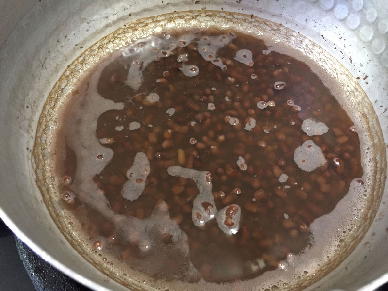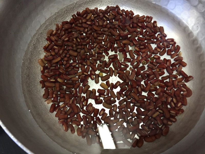 - Para cozinhar o azuki, coloque-o em uma panela com 500 mL de água, deixe ferver por 10 minutos e escorra toda a água.