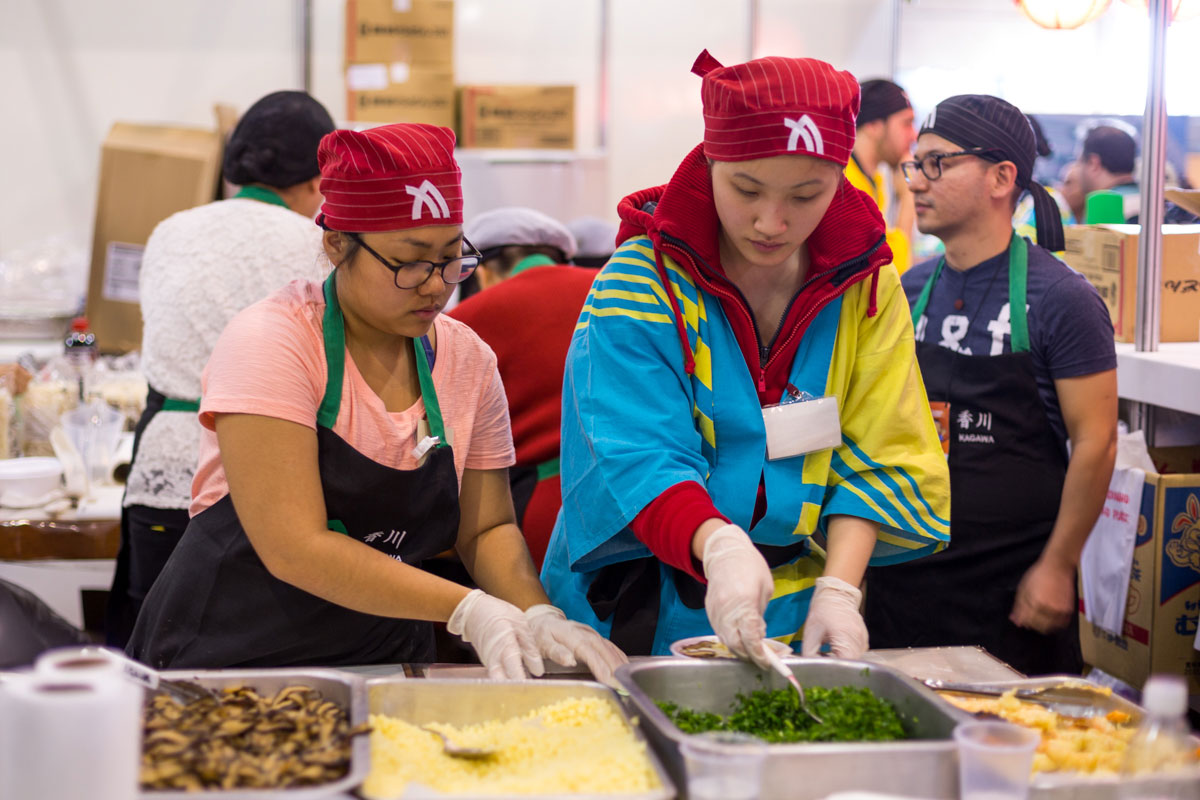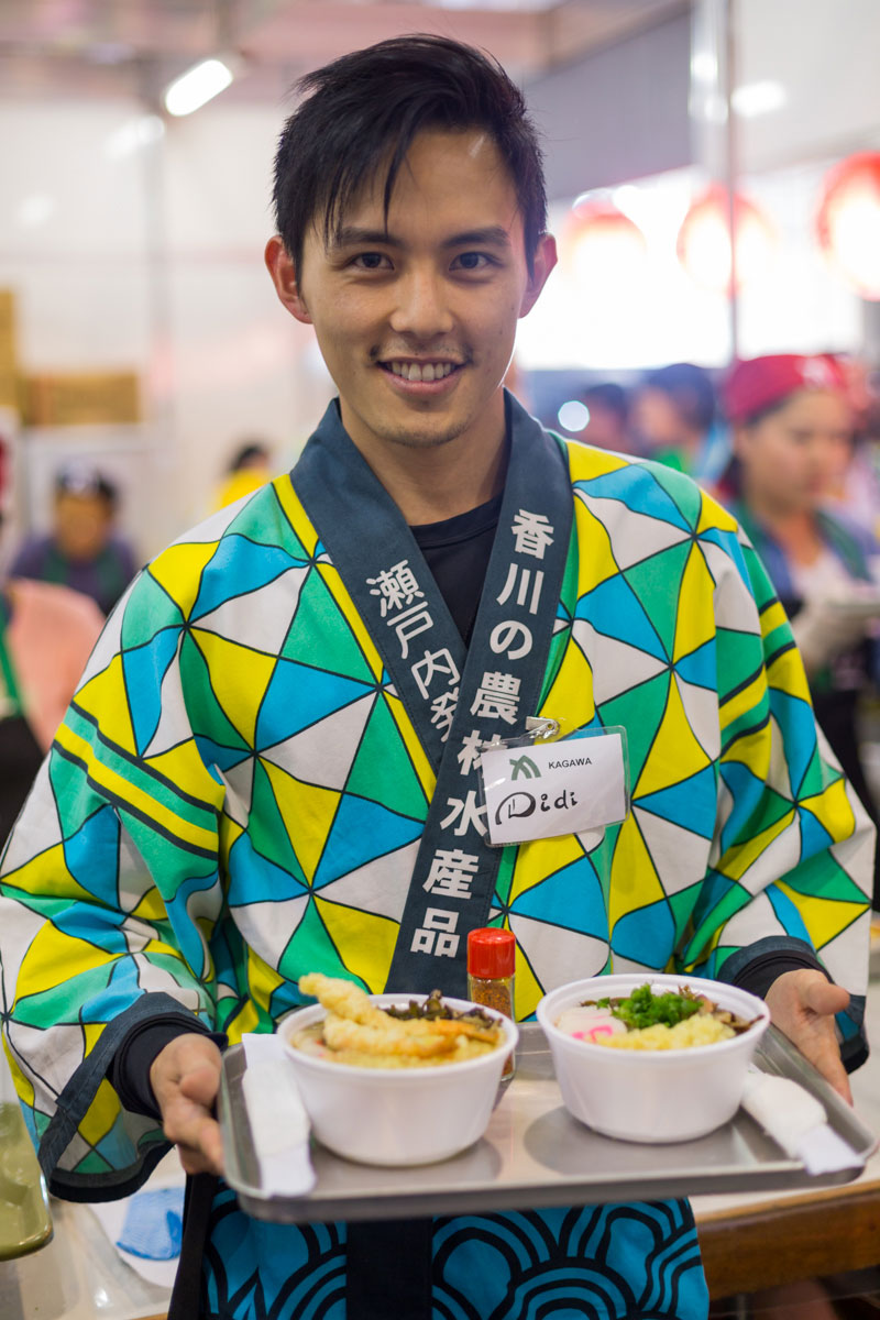 No estande de Kagawa, outro macarrão, também importado, é o destaque: o Sanuki udon. Durante o festival, são vendidas duas variações do macarrão, uma com tofu frito (kitsune udon) e outra com tempurá de camarão. A preparação dos ingredientes começa bem antes, com os jovens que se reúnem para limpar o camarão, trazido da Bahia, e para deixar tudo organizado na semana que antecede os três dias de evento.
