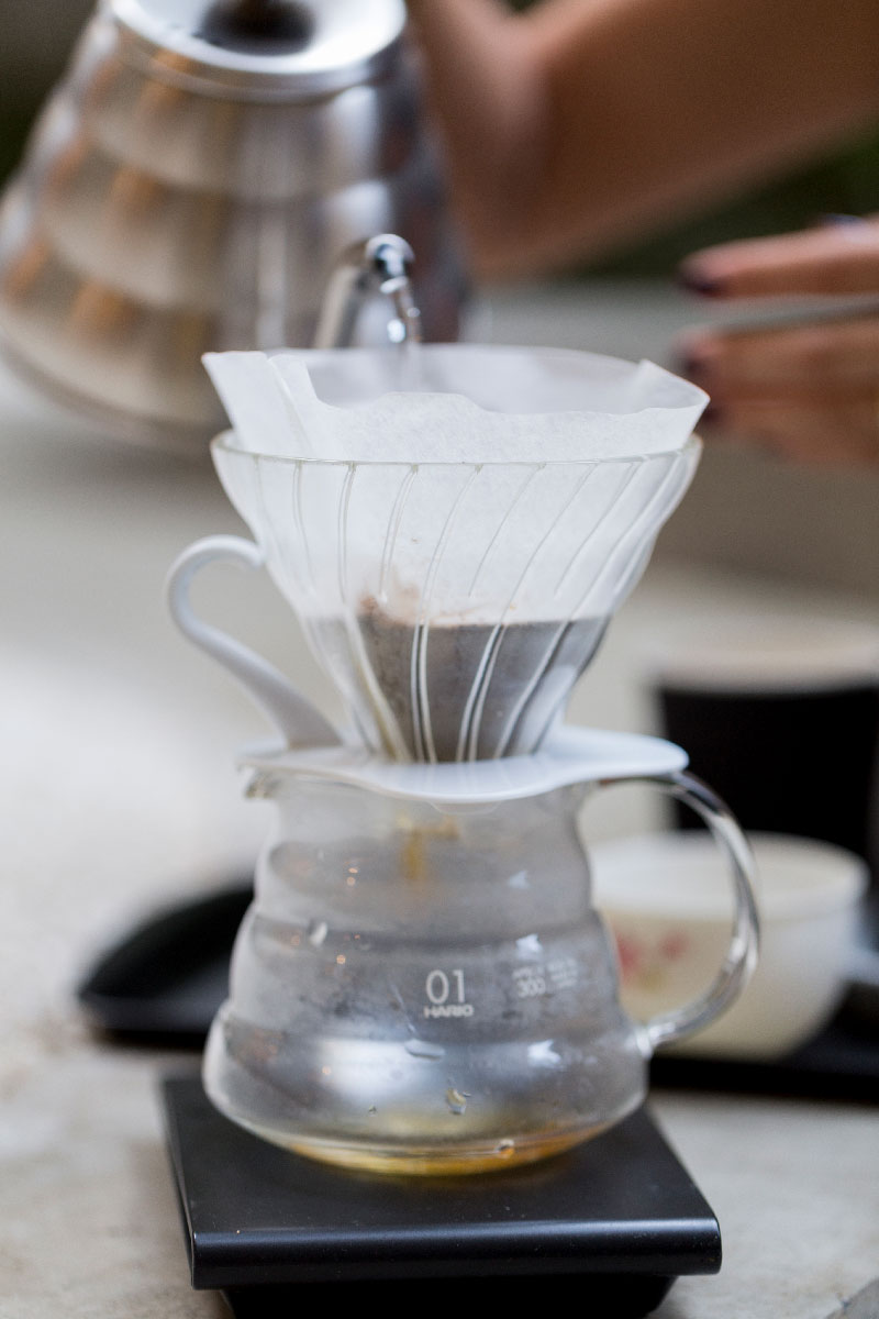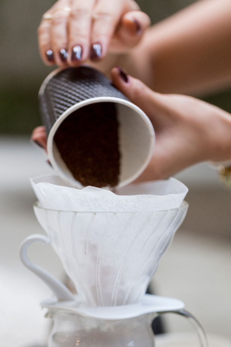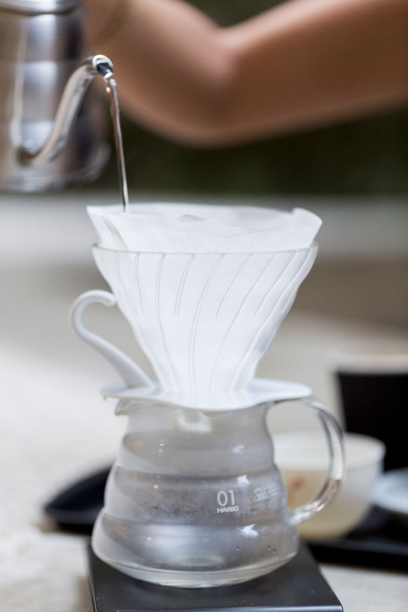 Para explicar essas sutilezas, Minori Nagai do Imi Café apresenta o método com um passo a passo de como fazer café filtrado. “O suporte tem ranhuras que fazem com que o líquido escorra de maneira uniforme em direção ao copo”, explica Minori. Além disso, esse detalhe também distancia o líquido do papel do filtro, o que diminui o tempo de contato do pó com a água e faz com que se crie um espaço para a circulação de ar, que permite a “expansão do café” ao liberar aromas e notas sutis da torra.