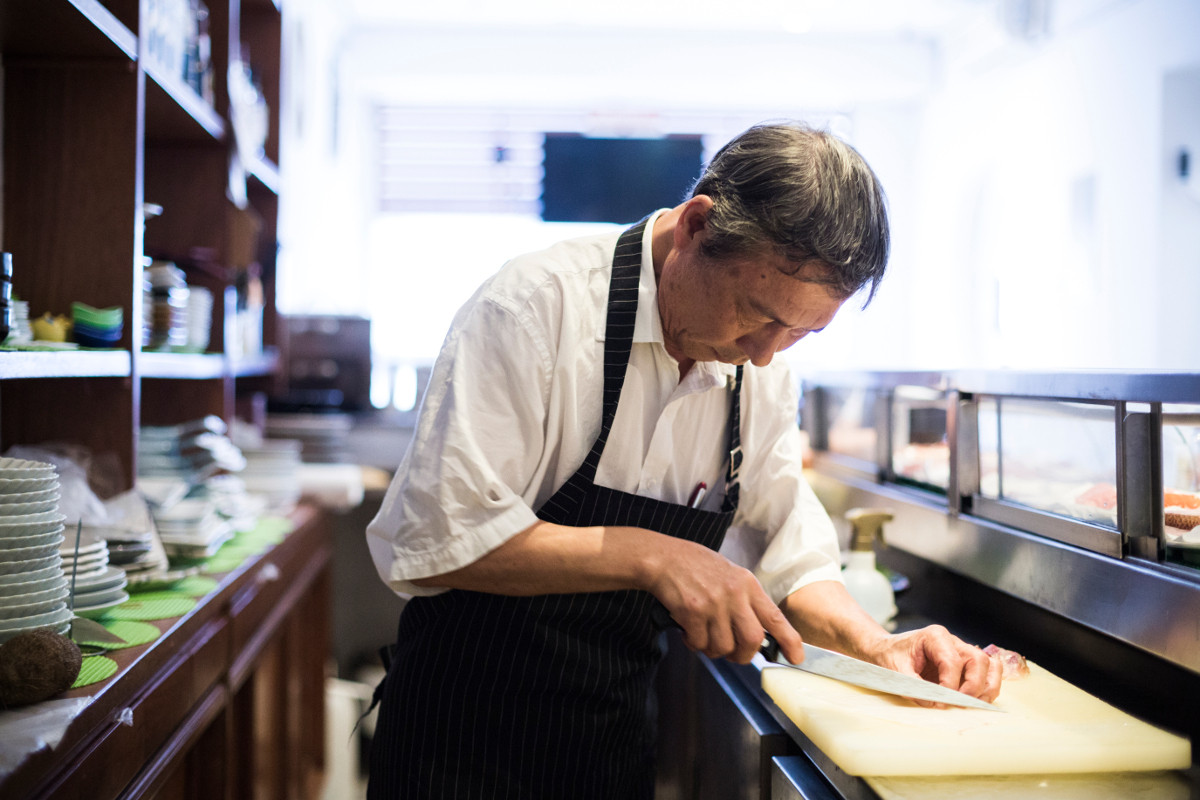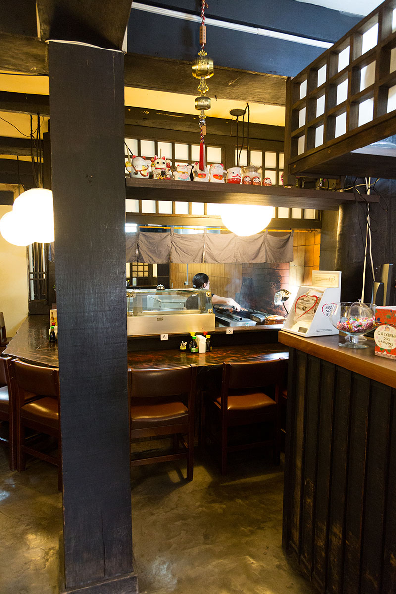 Conhecida como uma das mais tradicionais robatarias do bairro, a casa esconde atrás da fachada meio residencial dois ambientes distintos, um balcão com a grelha no térreo e um salão com balcão de sushis e mesas largas no primeiro andar. “É bom que novos restaurantes estejam chegando por aqui, pois atrai o movimento”, avalia o chef, que já trabalha no restaurante há 40 anos, “e não acho que atrapalha porque cada um tem o seu estilo”.