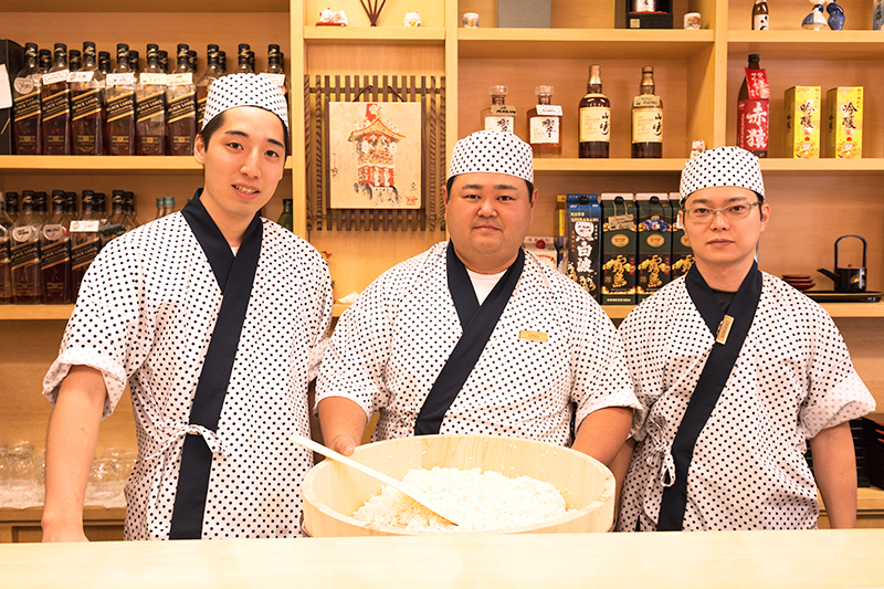 - O trio de sushi chefs do dia, tendo ao centro Hiromitsu Konno, e à esquerda Taiki Miyakawa e à direita Hiroaki Okabe, exibindo orgulhosos o shari Rafael Salvador