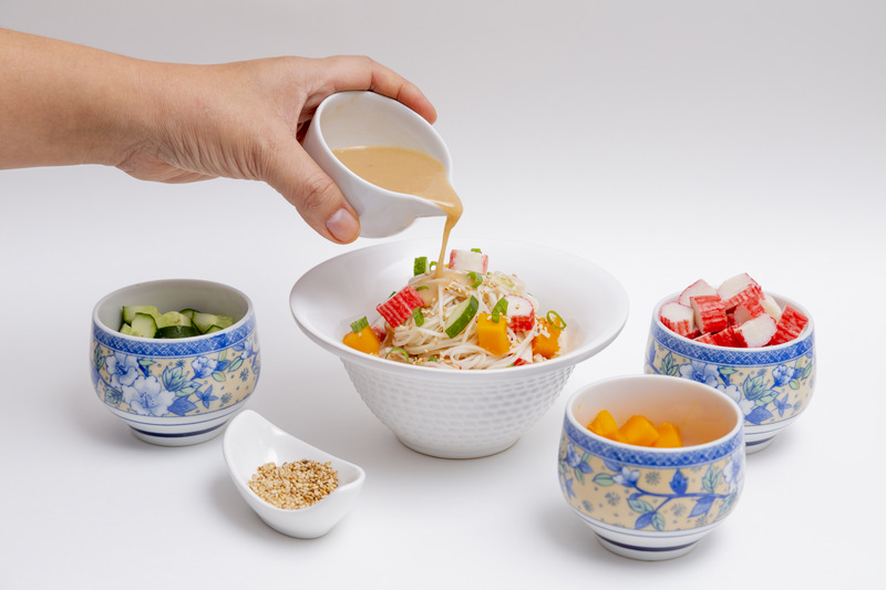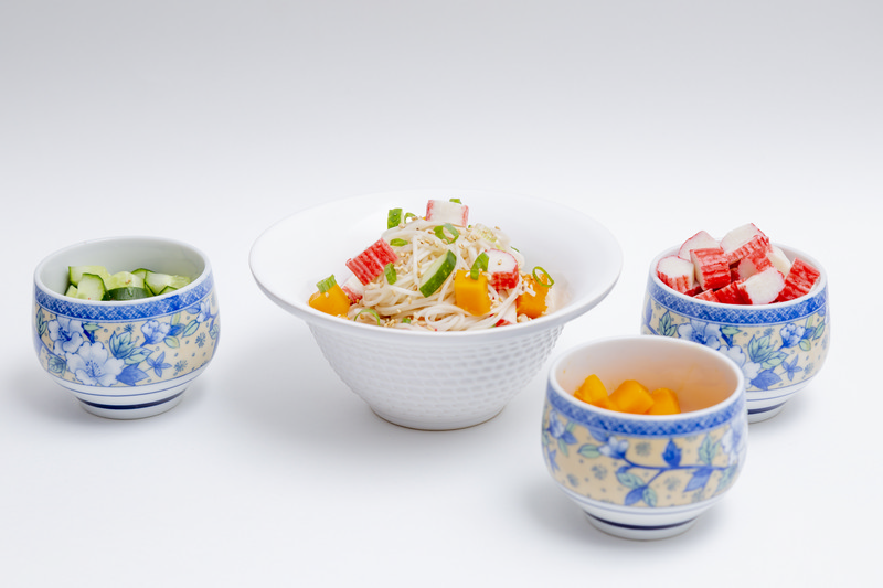 - Coloque o macarrão cozido e resfriado em uma tigela com o pepino, kani, manga.