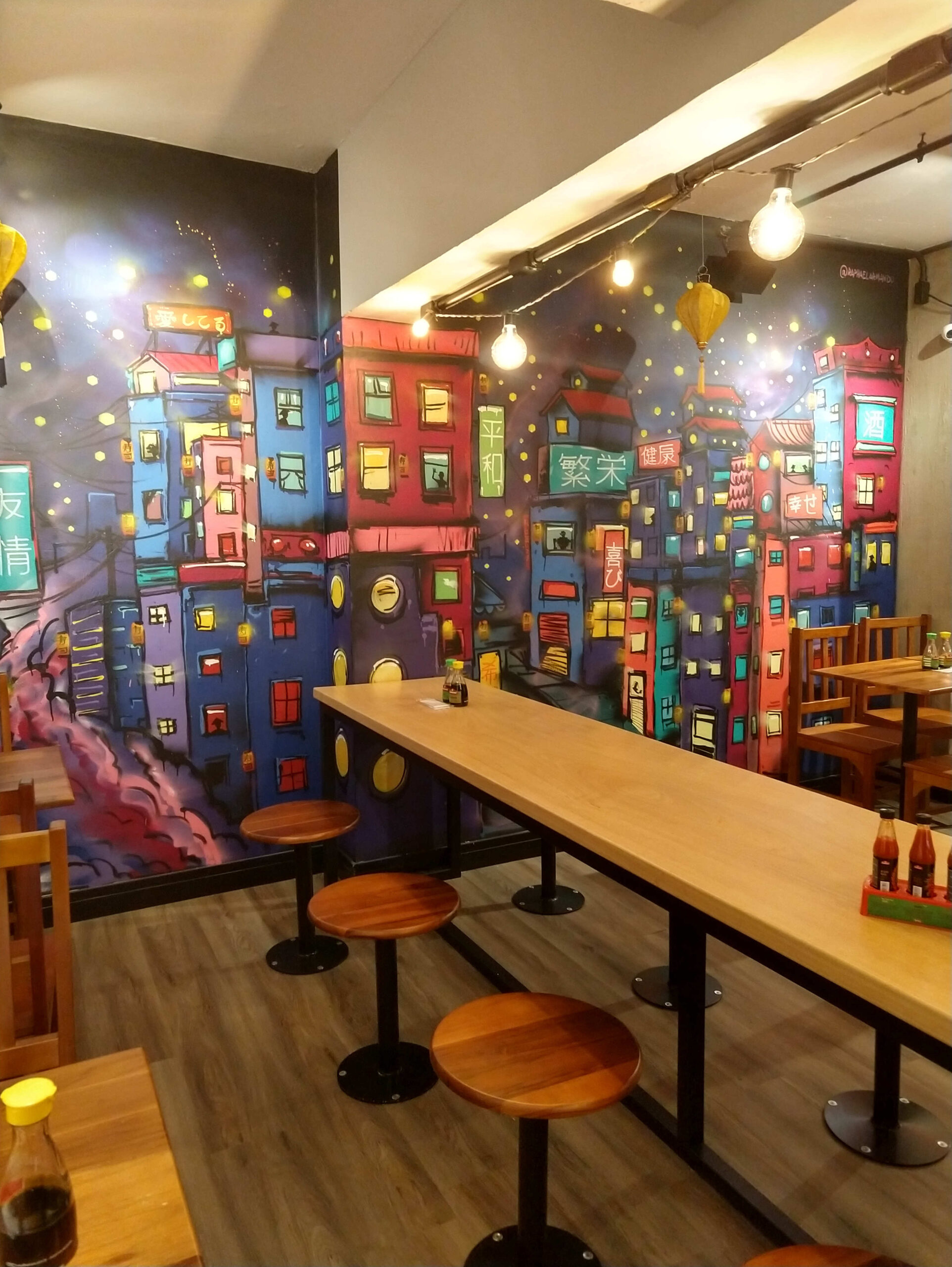 O local, que antigamente abrigava uma papelaria, foi todo redesenhado. Ganhou mais espaço para o fundo da loja, além de um mezanino e uma nova decoração que remete à cultura pop oriental. Na entrada, o Godzilla dá as boas vindas ao visitante; no fundo da loja, onde o pedido é feito, o balcão lembra uma vila medieval com janelas de papel sob a sombra de gueixas e samurais; no mezanino, a decoração remete a uma Chinatown, com o painel desenhado pelo ilustrador Raphael Armando e a decoração com luminosos em neon; ate é os banheiros ganharam um papel de parede de mangás.